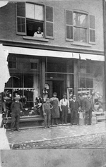 Description :GROUPE DE TRAVAILLEURS DEVANT LE MAGASIN GENERAL DE CHARLES BEAUREGARD. DES BOITES JONCHENT LE TROTTOIR ET DES OUTILS SONT SUSPENDUS. DES SOULIERS ET DES BOTTES SONT DERRIERE LA VITRINE DU MAGASIN. UN INDIVIDU SEUL EST A LA FENETRE SITUEE AU-D...