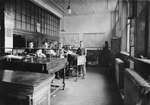 Description :GROUPE DE TRAVAILLEURS RASSEMBLES POUR LA PHOTO. LES TRAVAILLEURS SONT APPUYES SUR D'IMMENSES TABLES DE BOIS. DES CARTES MONTRANT LES TRACES DE CHEMINS DE FER SONT ACCROCHEES AU MUR. UN CALENDRIER EST ACCROCHE ENTRE LES DEUX FENETRES. LE PLANC...
