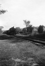 Description :LE TRAIN PASSE SUR LE CHEMIN DE FER QUI EST EN BORDURE DES RESIDENCES. DEUX MAISONS SONT PRESENTES SUR LE CLICHE. ON APERCOIT DES ARBRES ET UN CHATEAU D'EAU AU FOND.