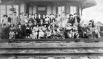 Description :QUARANTE PERSONNES, HOMMES ET FEMMES, SONT ASSEMBLEES SUR PLUSIEURS RANGS DEVANT LA GARE. DEVANT LE GROUPE, RAILS DE CHEMIN DE FER. LA GARE EST VUE EN PARTIE ET COMPREND DES FENETRES AVEC MOTIFS DE LOSANGES, UNE PARTIE EN ARRONDI ET DES CONSOL...