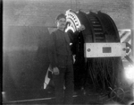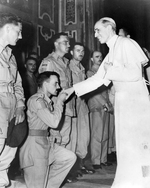Description :L'AMI DE CLAIRE LANGIS BAISE LA MAIN DU PAPE PIE XII. D'AUTRES MILITAIRES CANADIENS SONT EN RANG, ATTENDANT LE PASSAGE DE SA SAINTETE. LE PAPE EST VETU DE BLANC ET PORTE LA CALOTTE.
