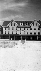 Description :VUE DE LA FACADE DE L'HOTEL "THE ATLANTIC". LE NOM DE L'HOTEL EST INSCRIT SUR UNE AFFICHE DE BOIS NOIRE. PLUSIEURS FENETRES SUR LA FACADE QUI EST LATTEE. ON APERCOIT DEUX CORNICHES SUR LE TOIT. CINQ PERSONNES SONT SUR LA GALERIE QUI EST SURPLO...