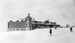 Description :VUE D'ENSEMBLE DE L'HOTEL. UNE TOUR SEPARE LES DEUX MOITIES DU BATIMENT. LE TOIT DE CETTE TOUR EST COURONNE D'UNE CLOCHE. DES SKIS SONT PLANTES DANS LA NEIGE PRES DE L'ENTREE DE L'HOTEL. DES SKIEURS DESCENDENT LA PENTE DEVANT L'HOTEL.