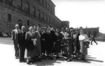 Description :22 PERSONNES SONT RASSEMBLEES POUR UNE PHOTO DE GROUPE DANS LA COUR INTERIEUR DU PALAZZO PITTI. L'IMMEUBLE EST EN PIERRE. AU PREMIER RANG : LA TROISIEME PERSONNE EST CLAIRE LANGIS.