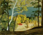 Description :PEINTURE DE STYLE IMPRESSIONISTE MONTRANT UNE CABANE ROUGE DANS LA FORET.