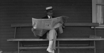 Description :UN HOMME ASSIS SUR UN BANC, LES JAMBES CROISEES, LISANT LE JOURNAL. IL PORTE UN VESTON ET UN CANOTIER. IL TIENT LE JOURNAL A LA HAUTEUR DU TORSE. UN AUTRE JOURNAL EST POSE AU BOUT DU BANC.