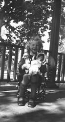 Description :UNE FILLETTE PREND LA POSE ASSISE SUR UNE CHAISE ET TENANT DEUX POUPEES. PHOTO PRISE A L'EXTERIEUR, SUR UNE GALERIE.