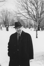 Description :PORTRAIT DE LOUIS-PHILIPPE DEMERS. EN ARIERRE-PLAN, ON VOIT UN CIMETIERE