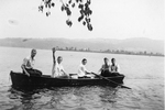Description :CINQ JEUNES HOMMES PRENNENT LA POSE DANS UNE BARQUE, PROBABLEMENT AU LAC MASSAWIPPI. ILS PORTENT DES CHEMISES ET REGARDENT LA CAMERA. L'UN D'EUX ENVOIE LA MAIN. EN HAUT, LES FEUILLES D'UN ARBRE. AU LOIN, LE RIVAGE.