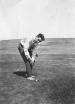 Description :UN GOLFEUR PENCHE AU-DESSUS DE SA BALLE, TENANT UN BATON TROP PETIT POUR LUI. IL PORTE UNE CHEMISE ET UNE CRAVATE.