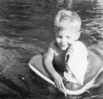 Description :UN ENFANT NAGE AVEC UNE BOUEE GONFLABLE A TETE DE CANARD.