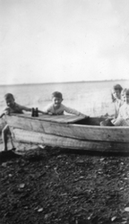 Description :QUATRE ENFANTS ET UNE BARQUE SUR LA PLAGE. IL S'AGIT DE JEAN DESILETS, D'UN AMI, D'IRENE ET DE FRANCOISE DESILETS. LES DEUX FILLETTES SONT ASSISES DANS LA BARQUE. DEUX JEUNES GARCONS TENTENT DE TIRER LA BARQUE VERS L'EAU. LA BARQUE EST FAITE D...