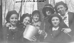Description :SIX JEUNES FILLES PRENNENT LA POSE LORS D'UNE VISITE A LA CABANE A SUCRES. ELLES PORTENT TOUTES UN CHAPEAU. - 9.1 : CERTAINES TIENNENT UNE PALETTE, TANDIS QU'UNE AUTRE TIENT UNE CHAUDIERE. LUCIENNE VERRET EST LA TROISIEME DE GAUCHE. - 9.2 : DE...