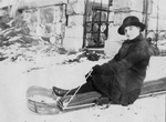 Description :LA JEUNE FILLE PREND LA POSE AVEC SON TRAINEAU. ELLE PORTE UN LONG MANTEAU, DES BOTTES ET UN CHAPEAU. ELLE EST ASSISE SUR SA TRAINE (1.1). ELLE L'A TIENT SUR SON DOS (1.2). MURET DE PIERRE ET GRILLES EN FER FORGE A L'ARRIERE.