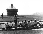 Description :13 ENFANTS ASSIS SUR DES RUINES DE FONDATIONS ECOUTENT L'ANIMATRICE. L'ANIMATRICE A DE LONGS CHEVEUX, PORTE UN TABLIER ET TIENT UN BALAIS. A L'ARRIERE-PLAN, UN HOMME DEGUISE EN SOLDAT DU DEBUT DU 19E SIECLE MARCHE VERS LE BLOCKHOUSE, OCTOGONAL...