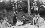 Description :SEPT PERSONNES FAISANT UN PIQUE-NIQUE. IL N'Y A QUE SIX PERSONNES SUR LA PHOTO 2.1, LUCIENNE VERRET ETANT PROBABLEMENT CELLE QUI TIENT L'APPAREIL. UNE NAPPE BLANCHE EST AU CENTRE SUR LAQUELLE ON RETROUVE DES FRUITS ET D'AUTRES ALIMENTS. LES PE...