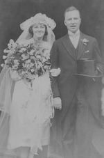 Description :LE COUPLE COTE A COTE PREND LA POSE DANS UN STUDIO. LUCIENNE VERRET, A GAUCHE, PORTE UNE ROBE BLANCHE AVEC UN LARGE CHAPEAU DE MARIEE. ELLE PORTE DES GANTS BLANCS ET TIENT UN GRAND BOUQUET A LA MAIN DROITE. ELLE TIENT SON EPOUX PAR LE BRAS. AL...