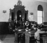 Description :SCENE DE LA COUR DE JUSTICE. LE JUGE VERRET AU FOND SUR SON FAUTEUIL. LE MEUBLE EST AGREMENTE DE JOLIES BOISERIES ET D'ARMOIRIES. 12 AUTRES PERSONNES DANS LA SALLE PORTANT LA TOGE OU L'HABIT. SUR LE MUR A DROITE, FENETRE ARRONDIE EN PLEIN CINT...