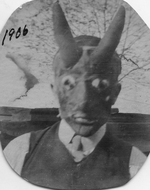 Description :PHOTO EN BUSTE D'UN HOMME MASQUE. LE MASQUE A DEUX CORNES SUR LE FRONT ET DE GRANDS YEUX. L'HOMME PORTE UNE CHEMISE, VESTE ET CRAVATE. IL EST POSSIBLE QUE CE SOIT ALBERT DESILETS.