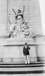 Sujet principal :ALBERT DESILETS, AGE D'ENVIRON 25 ANS, DEVANT UN MONUMENT