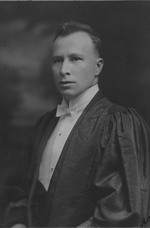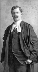 Description :PHOTO EN BUSTE D'ALBERT DESILETS. IL PORTE L'HABIT D'AVOCAT, UNE TOGE NOIRE AVEC UNE CHEMISE BLANCHE.