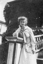 Description :LA JEUNE FEMME PREND LA POSE, ACCOUDEE A UN POTEAU DE RAMPE. ELLE PORTE DES VETEMENTS LONGS. A DROITE, LA BALUSTRADE. EDIFICE A L'ARRIERE.