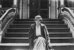 Description :LA JEUNE FEMME PREND LA POSE ASSISE DANS UN ESCALIER MENANT A UN EDIFICE. ELLE PORTE UN CHAPEAU ROND, UNE LONGUE JUPE ET UN LONG MANTEAU. BALUSTRADE DE CHAQUE COTE. A L'ARRIERE, PORTE DOUBLE ET DEUX PILASTRES.