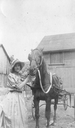 Description :LA JEUNE FEMME PREND LA POSE, TENANT LE CHEVAL PAR LES RENES. ELLE PORTE UNE LONGUE ROBE ET UN CHAPEAU. UN CAROSSE EST ATTELE AU CHEVAL. A L'ARRIERE, QUELQUES BATIMENTS.