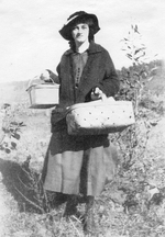 Description :UNE FEMME PREND LA POSE AVEC UN PANIER DE PIQUE-NIQUE DANS CHAQUE MAIN. ELLE PORTE UN CHAPEAU , UN CHANDAIL A MANCHES LONGUES ET UNE JUPE LONGUE.