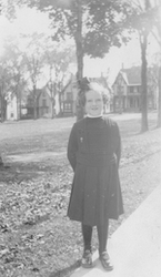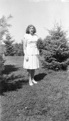 Description :ANDREE DESILETS PREND LA POSE A L'EXTERIEUR. ELLE EST VETUE D'UNE BLOUSE ET D'UNE JUPE NOIRES ET DE CHAUSSURES A SANGLE, SANS DOUTE L'UNIFORME DU MONT NOTRE-DAME. ELLE A UNE PETITE CROIX SUR LA POITRINE ET UNE BOUCLE DANS LES CHEVEUX. ELLE EST...
