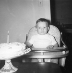 Description :BAMBIN DE 1 AN DANS SA CHAISE-HAUTE AVEC SON GATEAU D'ANNIVERSAIRE. IL PORTE UN T-SHIRT BLANC. LE GATEAU PORTANT UNE CHANDELLE EST DEPOSE SUR UN PLATEAU SUR LA TABLE.