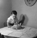 Description :70.1 : L'ENFANT, DEBOUT SUR UNE CHAISE, SOUFFLE LES DEUX CHANDELLES DE SON GATEAU. IL PORTE UN GILET A MANCHES COURTES. FIGURINES DE LAPIN SUR LE GATEAU. NAPPE EN DENTELLE. GATEAU MAISON. - 70.2 : JEAN DESILETS JR., PREND LA POSE, ASSIS SUR UN...