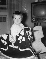Description :UN ENFANT SUR UN CHEVAL DE BOIS PREND LA POSE. LE CHEVAL DE BOIS EST FAIT DE DEUX PANNEAUX AVEC LE SIEGE AU MILIEU. CHEVAL NOIR AVEC TACHES BLANCHES; ETOILE SUR LA SELLE. A L'ARRIERE, UNE TELEVISION SUR PIEDS.