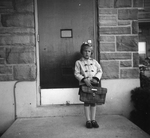 Description :UNE ENFANT D'ENVIRON 5 ANS AVEC SON SAC D'ECOLE. ELLE PORTE UN MANTEAU ET UNE JUPE. DERRIERE ELLE, UN MUR DE PIERRES ET UNE PORTE.