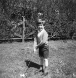 Description :UN ENFANT PREND LA POSE AVANT DE FRAPPER LA BALLE DE GOLF. IL PORTE UNE VESTE AVEC UNE CHEMISE ET DES PANTALONS COURTS. IL TIENT LE BATON DE GOLF, PRET A S'ELANCER.