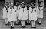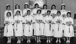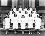 Description :LES 20 JEUNES FEMMES PRENNENT LA POSE DANS LES MARCHES DE L'ETABLISSEMENT. ELLES PORTENT TOUTES DES VETEMENTS BLANCS AVEC DES GANTS. ANDREE DESILETS EST LA QUATRIEME PERSONNE DE LA PREMIERE RANGEE.