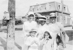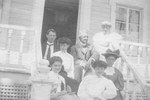 Description :SEPT PERSONNES SONT ASSISES DANS LES MARCHES D'UNE RESIDENCE. FRANCOIS LEMIEUX, AU CENTRE, EST ENTOURE DE SA FEMME JEANNE LEMIEUX-LEGRIS ET DE SES ENFANTS, DONT MATHILDE LEMIEUX, SUR LA DEUXIEME RANGEE, A GAUCHE.
