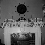 Description :UNE TRENTAINE DE CARTES DE SOUHAITS POSEES OU SUSPENDUES SUR UN FOYER. LE CONTOUR DU FOYER EST BLANC. SUR LE MUR AU-DESSUS, UN CADRE QUI RESSEMBLE A UN GOUVERNAIL DE NAVIRE.