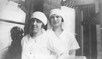 Description :LES DEUX INFIRMIERES PORTENT L'UNIFORME ET LA COIFFE EXIGES POUR LA SALLE D'OPERATION. ELLES SONT PLACEES DEVANT DEUX FENETRES A L'EXTERIEUR DE L'HOPITAL.