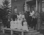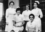 Description :DEVANT LA FACADE DE L'EDIFICE NORTON, RESIDENCE DES INFIRMIERES, LES DIPLOMEES SONT PLACEES SUR DEUX RANGS. SUR LA PREMIERE RANGEE : CAROLYN WESTOVER, ELIZABETH CUTTS, SHIRLEY ROBINSON, REJEANNE POUTRE, DOREEN ALDRICH, BETSY DESRUISSEAUX; SUR ...