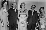 Description :MURIEL HAMMOND, PRESIDENTE DE L'ASSOCIATION DES ANCIENNES ELEVES, SON EPOUX M. ERWIN WATSON, MLLE JEAN MACMILLAN, M. EARL GOULD ET SON EPOUSE SONT PLACES SUR UNE RANGEE.LES DAMES PORTENT ROBE LONGUE, GANTS DE SOIREE ET BOURSES BRODEES.