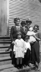 Description :TROIS ADULTES ET QUATRE ENFANTS DEVANT UNE MAISON. PREMIERE RANGEE : CLAIRE LANGIS, ?, ?. DEUXIEME RANGEE : JESSIE DESROCHERS, LEO LANGIS, ?. ILS SONT TOUS DANS LES MARCHES D'UN ESCALIER DE BOIS. L'ESCALIER MENE A UNE PORTE DE COTE DU BATIMENT...