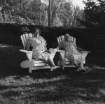 Description :DEUX FEMMES SONT ASSISES SUR DES CHAISES EN BOIS. LES CHAISES SONT PEINTUREES EN BLANC. LA FEMME DE DROITE EST JESSIE DESROCHERS-LANGIS. ELLE PORTE UNE ROBE FLEURIE. UNE HAIE DE CEDRES EST DERRIERE LES FEMMES.