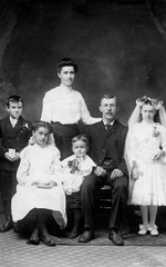 Description :PHOTO DE STUDIO. UNE FAMILLE PREND LA POSE AVANT LA PREMIERE COMMUNION D'UNE DES FILLES. LA SIXIEME PERSONNE (A DROITE) EST LA PREMIERE COMMUNIANTE. ELLE PORTE UNE COURONNE DE FLEURS ET UN VOILE SUR LA TETE. ELLE EST VETUE DE BLANC. SON PERE E...