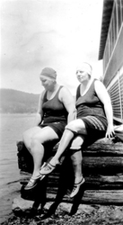 Description :UNE FEMME INCONNUE ET JESSIE LANGIS EN MAILLOT DE BAIN, ASSISES PRES DU CHALET, QUE L'ON APERCOIT EN PARTIE. JESSIE PORTE UN CASQUE DE BAIN, UNE SERVIETTE DE PLAGE AUTOUR DE LA TAILLE ET DES BAS DE NYLON ROULES SOUS LES GENOUX. L'AUTRE FEMME P...