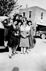 Description :LA TROISIEME PERSONNE EST JESSIE LANGIS. ELLE A UN MANTEAU NOIR ET UN CHAPEAU. DEUX AUTRES FEMMES SONT AVEC ELLE ET UN GARCON EST A LA GAUCHE DE JESSIE. DE LA NEIGE EST SUR LE SOL ET ON APERCOIT UNE MAISON.