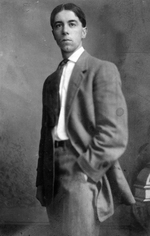 Description :PHOTO DE STUDIO AVEC DECOR EN TROMPE-L'OEIL. GEORGES LANGIS, VUE DE BIAIS. IL PORTE UNE CHEMISE BLANCHE ET UN VESTON. UNE MAIN EST DANS SA POCHE DE PANTALON. IL A UNE RAIE AU CENTRE DE LA TETE. UN OBJET EST POSE SUR UN MEUBLE DERRIERE LUI.
