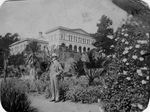 Description :UN HOMME INCONNU DANS UN DECOR DE PAYS TROPICAL. IL PORTE UN CHAPEAU AVEC UN COMPLET VESTON-CRAVATE. SON COMPLET EST RAYE. LE PAYSAGE MONTRE DES PALMIERS ET D'AUTRES ARBUSTES CARACTERISTIQUES DES PAYS CHAUDS. A DROITE, UN ARBRE AVEC DES FLEURS...
