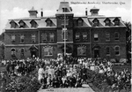 Description :LES ELEVES DE LA SHERBROOKE ACADEMY PRENNENT LA POSE DEVANT LEUR ECOLE, DE STYLE SECOND EMPIRE.