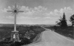 Description :GRANDE ROUTE ALLANT A MAGOG. EN AVANT-PLAN A GAUCHE, UNE croix diverses; A DROITE PRES DES ARBRES, DEUX PERSONNES MARCHENT DANS LA RUE. EN ARRIERE-PLAN, LE VILLAGE DE MAGOG.